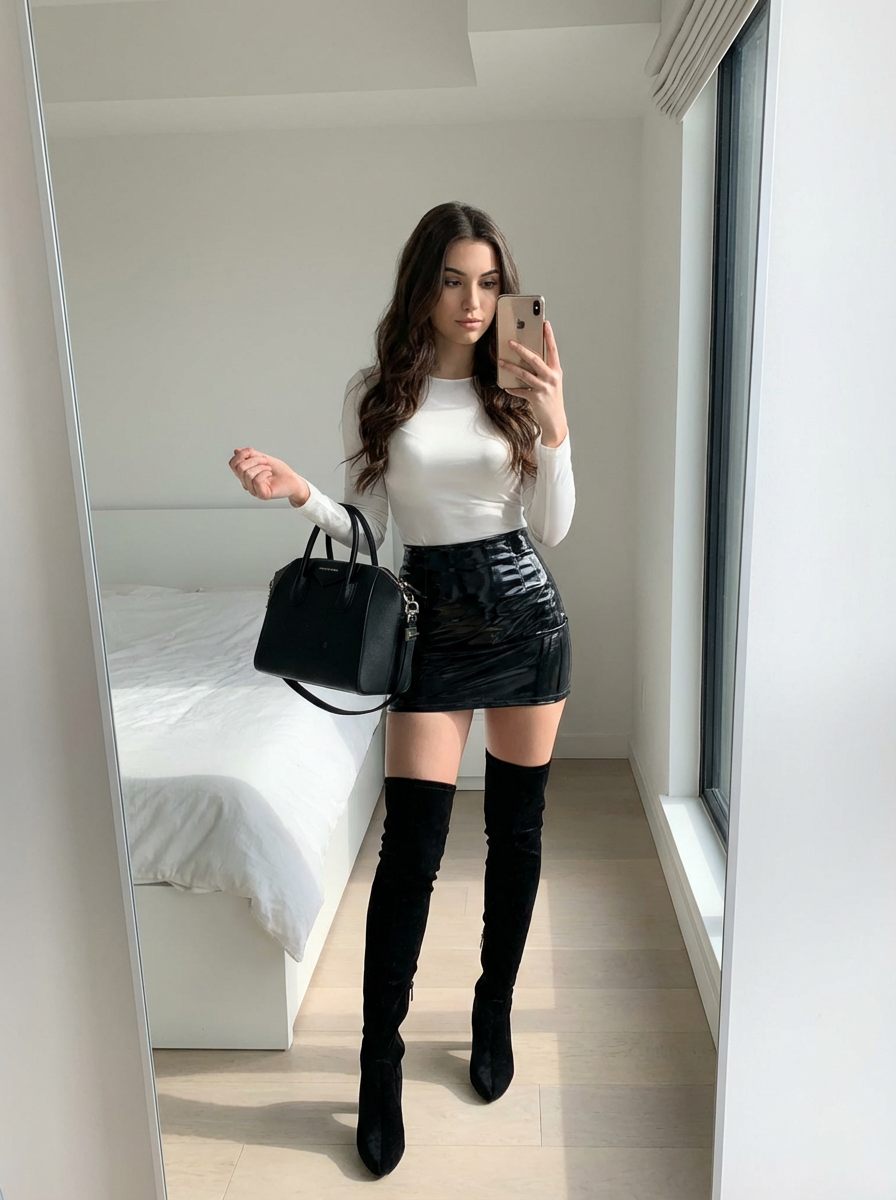 {"structured_generation_request_v4": {"meta_information": {"schema_version": "4.0.1-extreme", "request_type": "image_synthesis_from_text", "intended_use": "high_fidelity_lifestyle_rendering"}, "critical_constraints": {"identity_lock": {"target_entity": "subject_face", "status": "immutable", "instruction": "CRITICAL: Do not alter facial features or bone structure under any circumstances."}, "negative_assertion_tags": ["cartoonish rendering", "low resolution texture", "distorted anatomy", "blurred reflections", "oversaturated colors"]}, "technical_specifications": {"visual_fidelity": {"resolution_class": "4K UHD", "texture_rendering": "macro_level_detail (visible fabrics)"}, "camera_parameters": {"focal_length": "85mm", "aperture": "f/2.8", "depth_of_field": "shallow", "focus_target": "subject_face"}, "lighting_setup": {"primary_source": "natural_window_light", "direction": "side_lighting", "quality": "soft_diffused", "color_temperature": "5600K"}}, "subject_definition": {"demographic_profile": {"age_range": "young_adult", "gender": "female"}, "physical_attributes": {"hair": {"color": "dark_brown", "style": "long_wavy", "texture": "natural"}, "skin": {"tone": "fair", "texture": "smooth"}, "eyes": {"color": "brown", "expression": "confident"}}, "pose_configuration": {"primary_action": "mirror_selfie", "body_orientation": "three_quarter_turn", "facial_direction": "toward_camera", "postural_goal": "accentuate_body_curves", "limb_states": {"lower_limbs": "asymmetrical_stance (one leg forward)", "right_upper_limb": "active (holding phone)", "left_upper_limb": "passive (bearing weight of accessory)"}}, "wardrobe_manifest": [{"slot": "torso_layer_1", "item_type": "top/blouse", "attributes": ["fitted", "long_sleeved", "elegant"], "color_data": {"dominant": "white silk"}}, {"slot": "lower_body_outer", "item_type": "mini_skirt (latex)", "attributes": ["tight", "high_waisted", "waist_defining"], "color_data": {"dominant": "pvc latex"}}, {"slot": "lower_body_inner", "item_type": "bare legs", {"slot": "footwear", "item_type": "thigh high velvet boots", "attributes": ["thigh_high", "leather_material"], "color_data": {"dominant": "black"}}, {"slot": "held_accessory_left", "item_type": "handbag", "attributes": ["designer_brand", "hanging_from_forearm"], "color_data": {"dominant": "black"}}]}, "environment_matrix": {"setting_type": "interior_bedroom", "aesthetic_style": ["modern", "minimalist"], "key_objects": {"primary_reflector": {"type": "mirror", "shape": "rectangular", "size": "large", "property": "sharp_reflection_surface"}}}}}