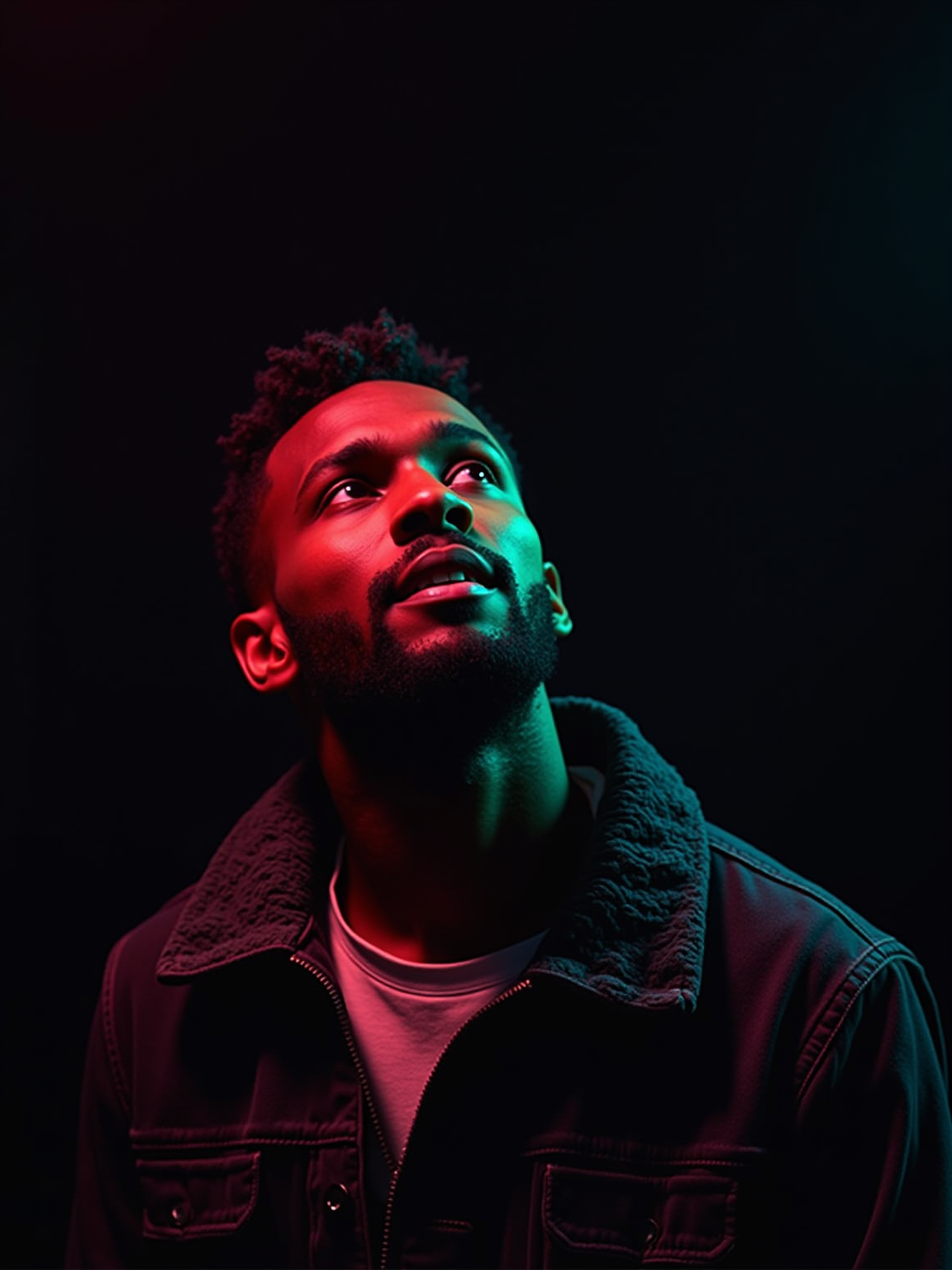 Studio portrait of a model looking up, illuminated by vibrant red, green, and blue gel lighting from different angles, creating a bold and futuristic RGB glow on their skin. The background is dark and minimal to emphasize the colorful lighting on their face. model wears a dark textured jacket with the collar slightly up. Cinematic, edgy, cyberpunk-inspired aesthetic.
