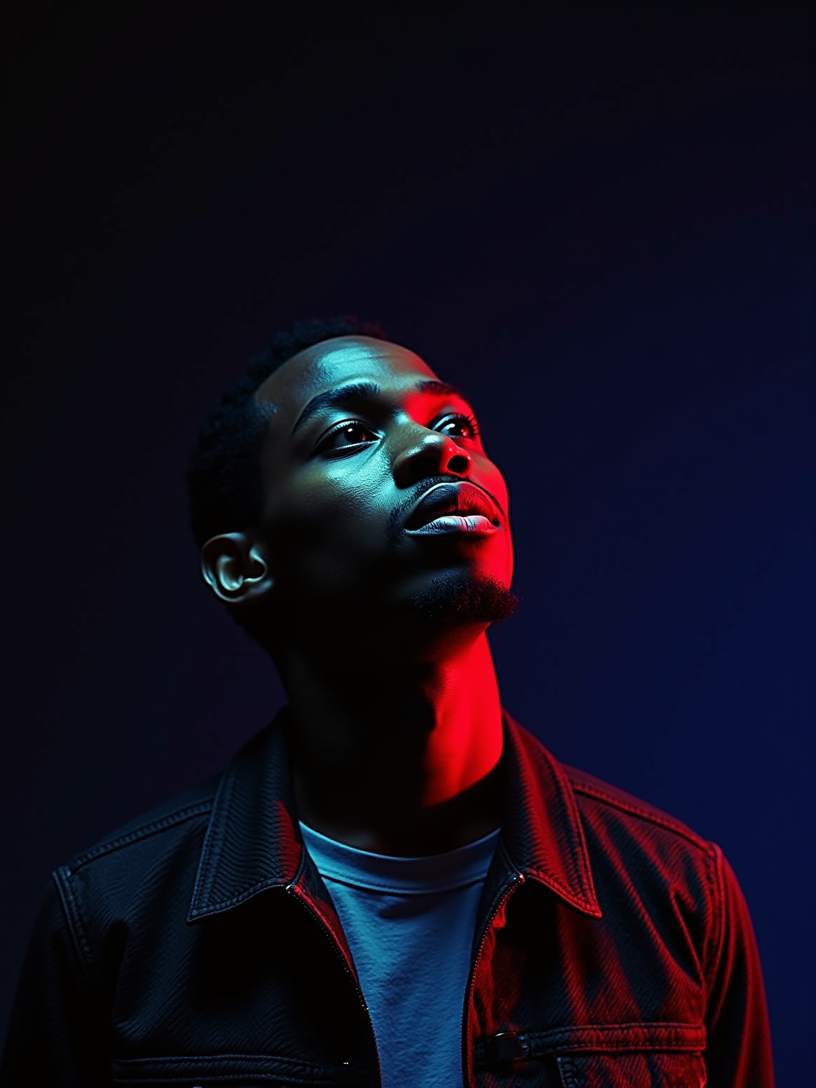 Studio portrait of a model looking up, illuminated by vibrant red, green, and blue gel lighting from different angles, creating a bold and futuristic RGB glow on their skin. The background is dark and minimal to emphasize the colorful lighting on their face. model wears a dark textured jacket with the collar slightly up. Cinematic, edgy, cyberpunk-inspired aesthetic.