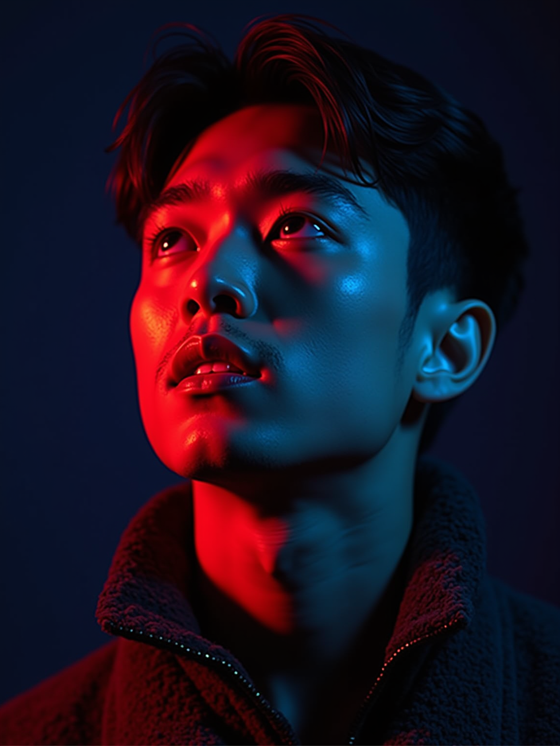 Studio portrait of a model looking up, illuminated by vibrant red, green, and blue gel lighting from different angles, creating a bold and futuristic RGB glow on their skin. The background is dark and minimal to emphasize the colorful lighting on their face. model wears a dark textured jacket with the collar slightly up. Cinematic, edgy, cyberpunk-inspired aesthetic.