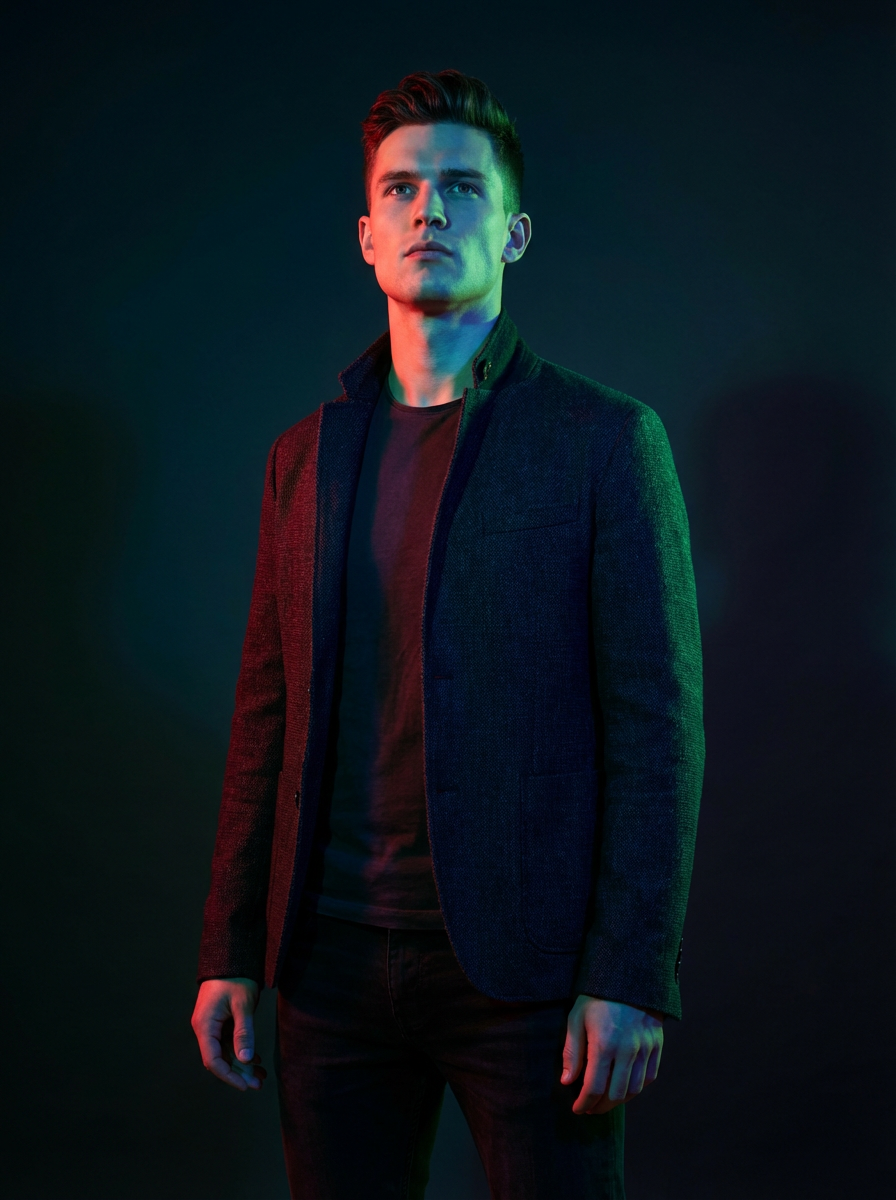 Studio portrait of a model looking up, illuminated by vibrant red, green, and blue gel lighting from different angles, creating a bold and futuristic RGB glow on their skin. The background is dark and minimal to emphasize the colorful lighting on their face. model wears a dark textured jacket with the collar slightly up. Cinematic, edgy, cyberpunk-inspired aesthetic.
