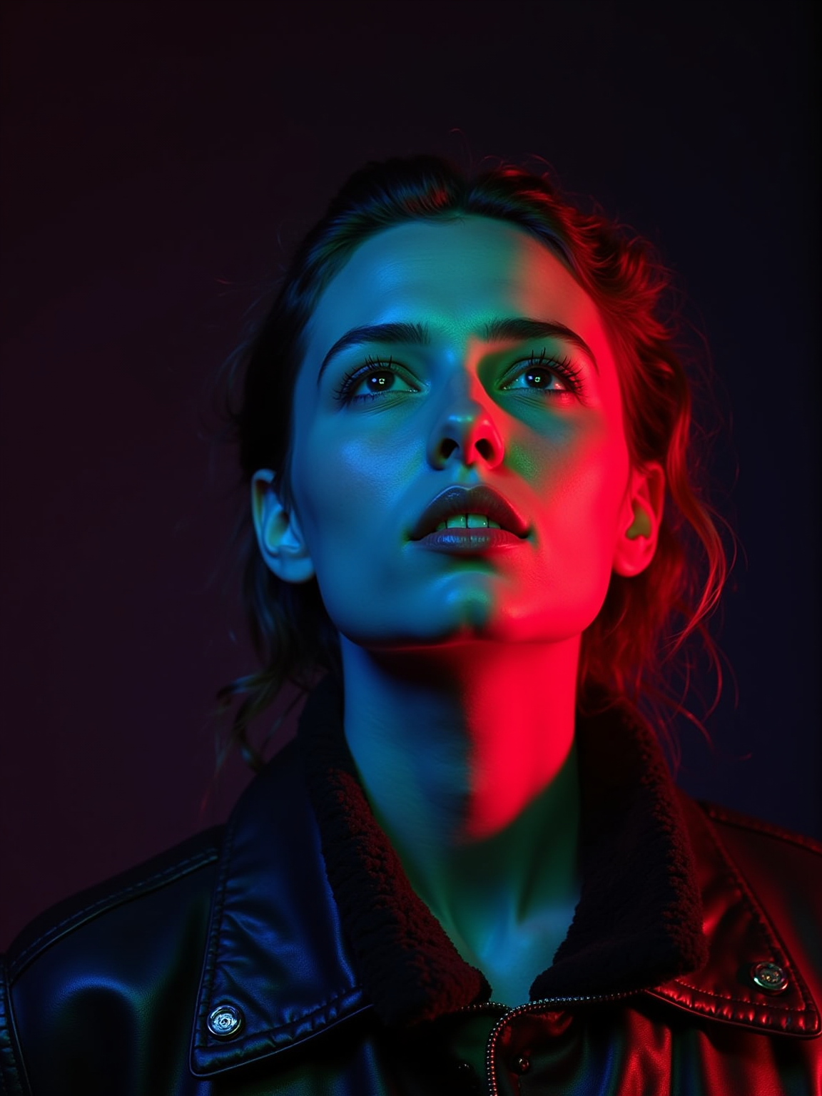 Studio portrait of a model looking up, illuminated by vibrant red, green, and blue gel lighting from different angles, creating a bold and futuristic RGB glow on their skin. The background is dark and minimal to emphasize the colorful lighting on their face. model wears a dark textured jacket with the collar slightly up. Cinematic, edgy, cyberpunk-inspired aesthetic.