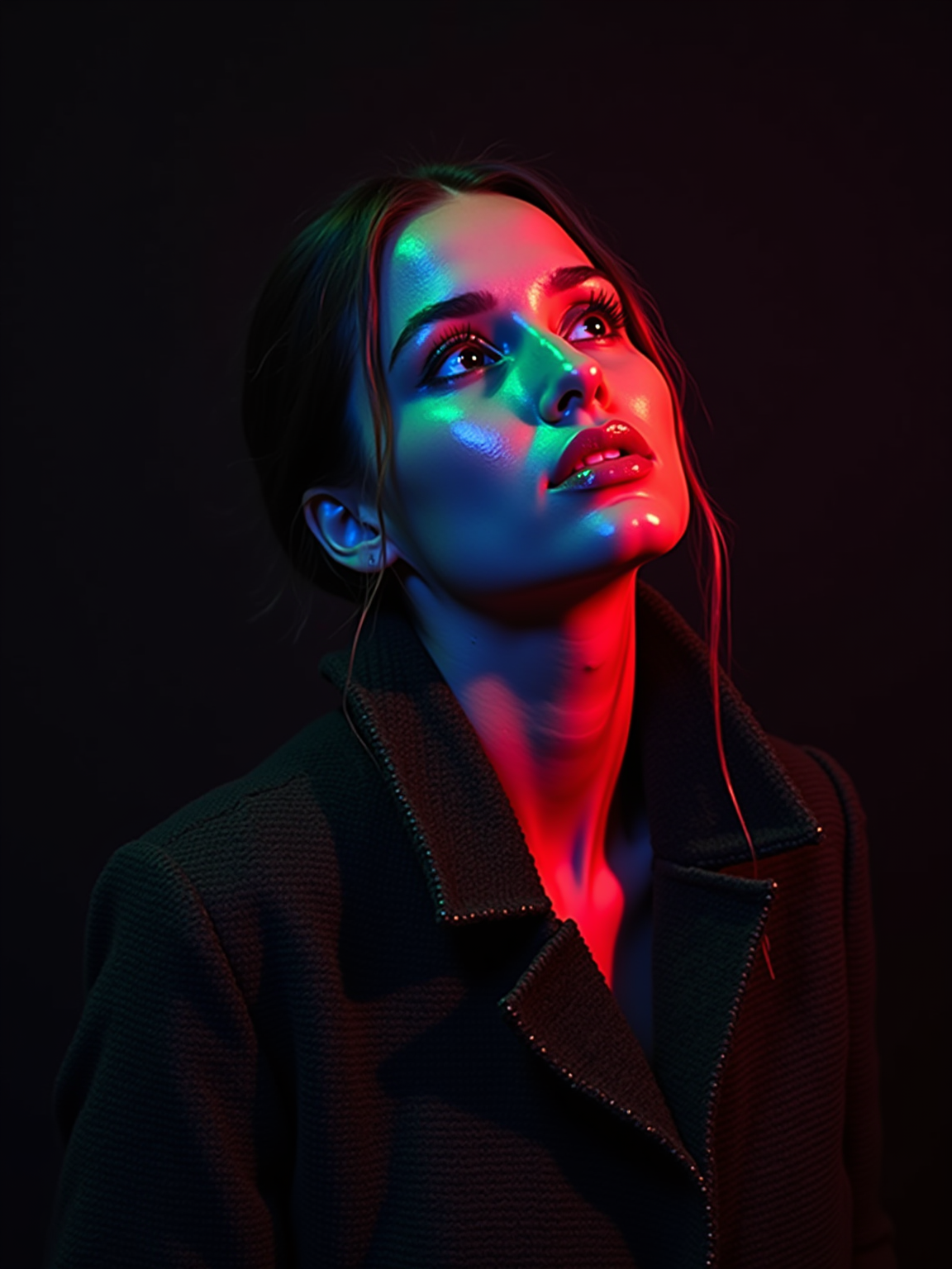 Studio portrait of a model looking up, illuminated by vibrant red, green, and blue gel lighting from different angles, creating a bold and futuristic RGB glow on their skin. The background is dark and minimal to emphasize the colorful lighting on their face. model wears a dark textured jacket with the collar slightly up. Cinematic, edgy, cyberpunk-inspired aesthetic.