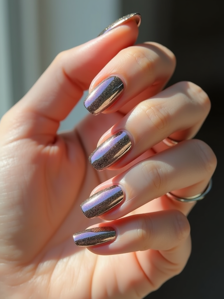 studio shot of chrome glazed donut nails with glossy reflections, hand posed elegantly, modern beauty lighting, high-shine texture visible, magazine-style presentation