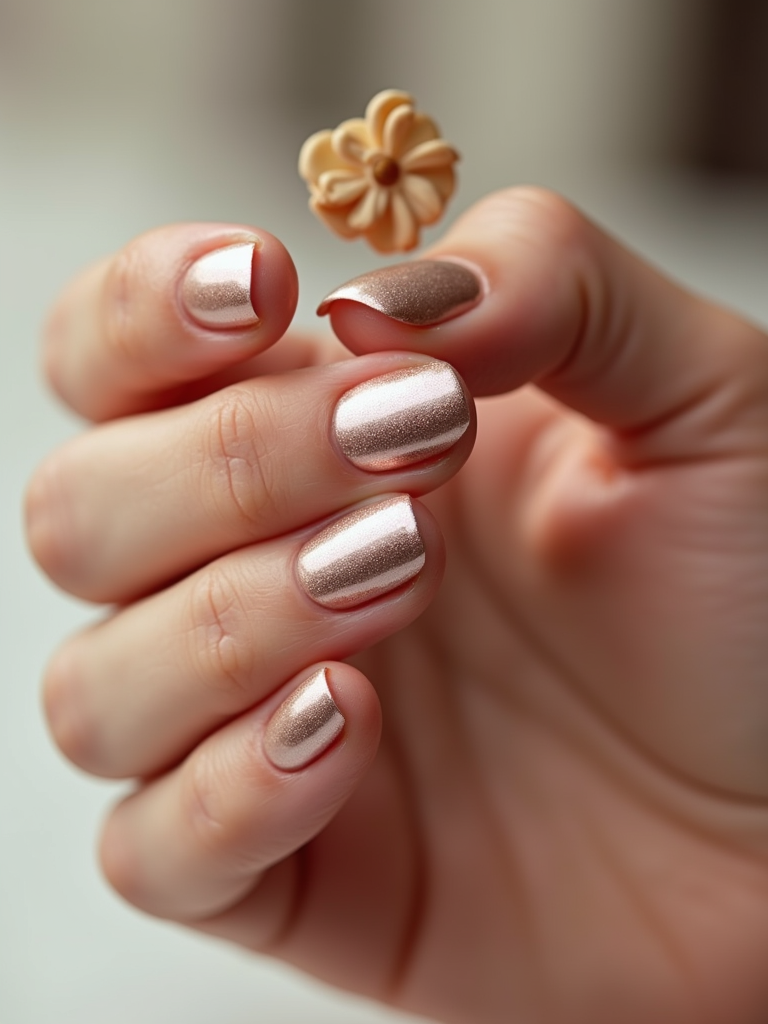 studio shot of chrome glazed donut nails with glossy reflections, hand posed elegantly, modern beauty lighting, high-shine texture visible, magazine-style presentation