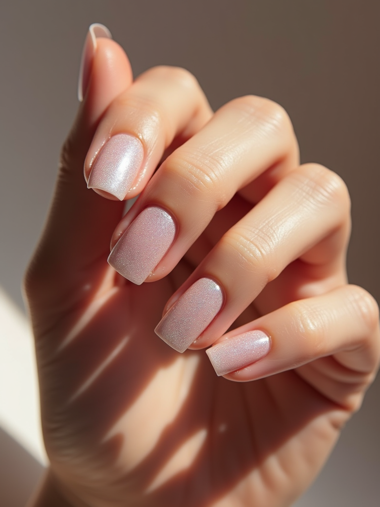studio shot of chrome glazed donut nails with glossy reflections, hand posed elegantly, modern beauty lighting, high-shine texture visible, magazine-style presentation