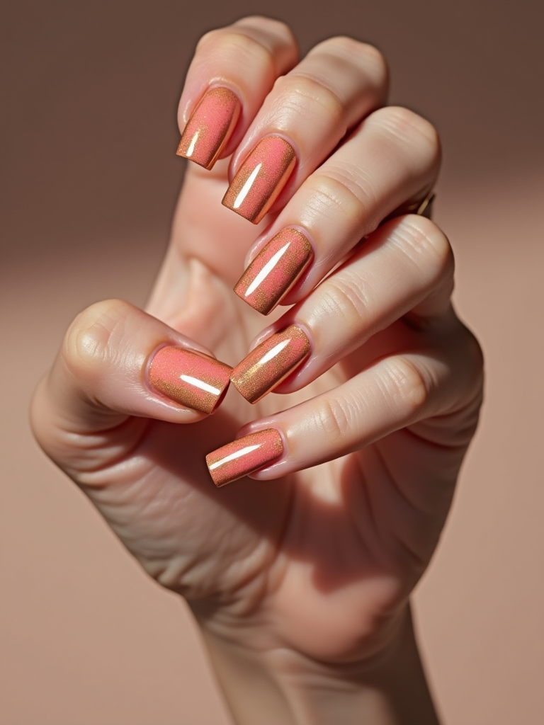 studio shot of chrome glazed donut nails with glossy reflections, hand posed elegantly, modern beauty lighting, high-shine texture visible, magazine-style presentation