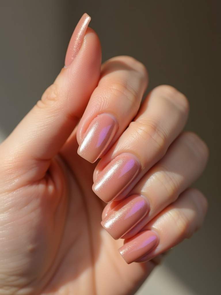 studio shot of chrome glazed donut nails with glossy reflections, hand posed elegantly, modern beauty lighting, high-shine texture visible, magazine-style presentation