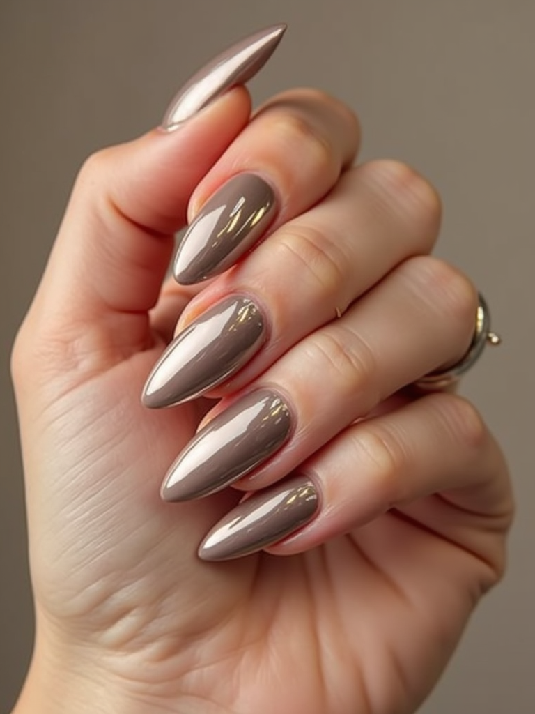 studio shot of chrome glazed donut nails with glossy reflections, hand posed elegantly, modern beauty lighting, high-shine texture visible, magazine-style presentation