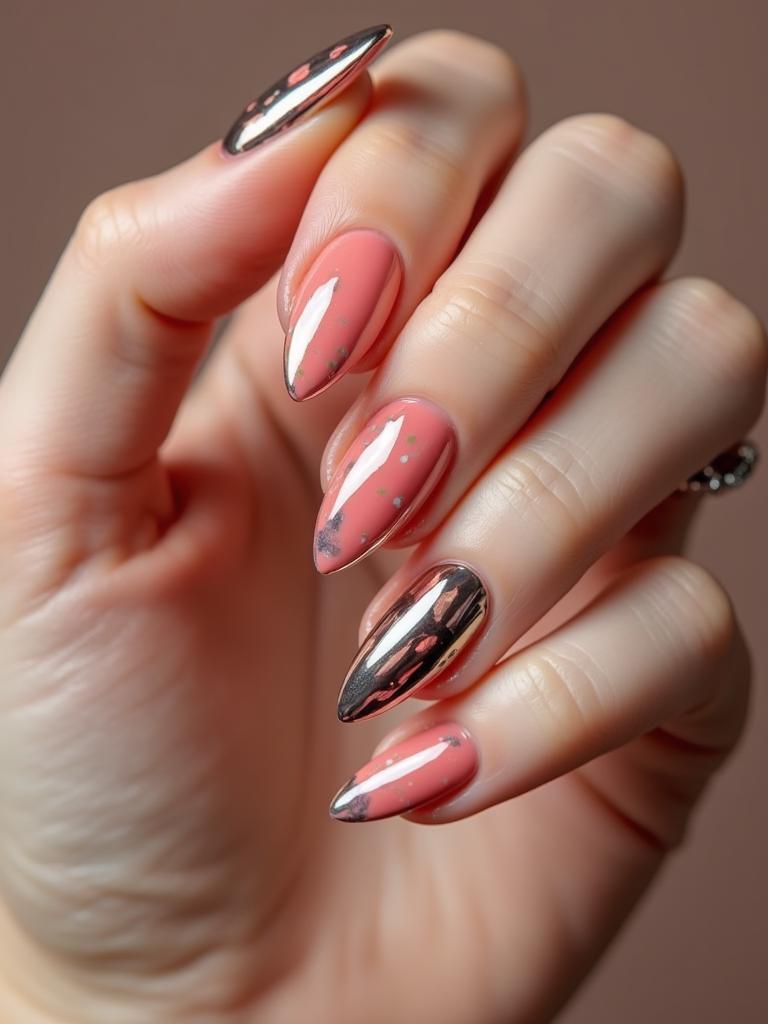 studio shot of chrome glazed donut nails with glossy reflections, hand posed elegantly, modern beauty lighting, high-shine texture visible, magazine-style presentation