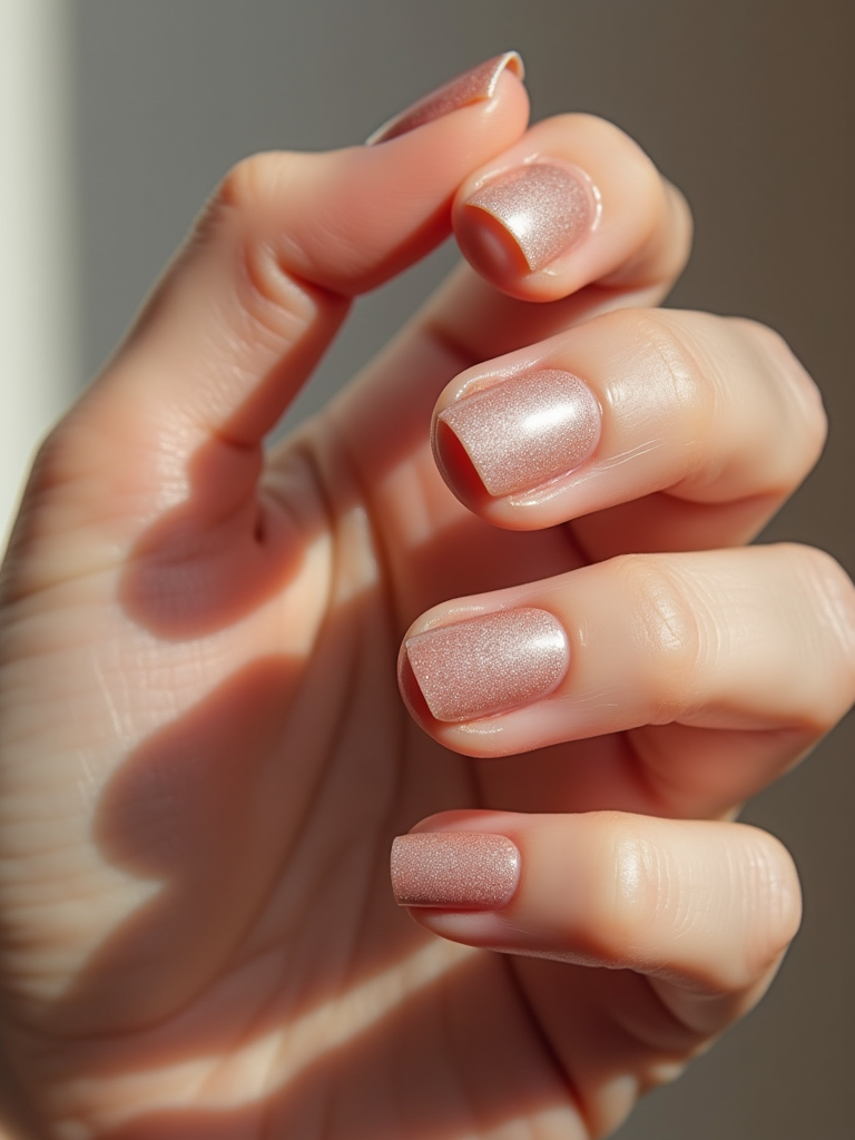 studio shot of chrome glazed donut nails with glossy reflections, hand posed elegantly, modern beauty lighting, high-shine texture visible, magazine-style presentation