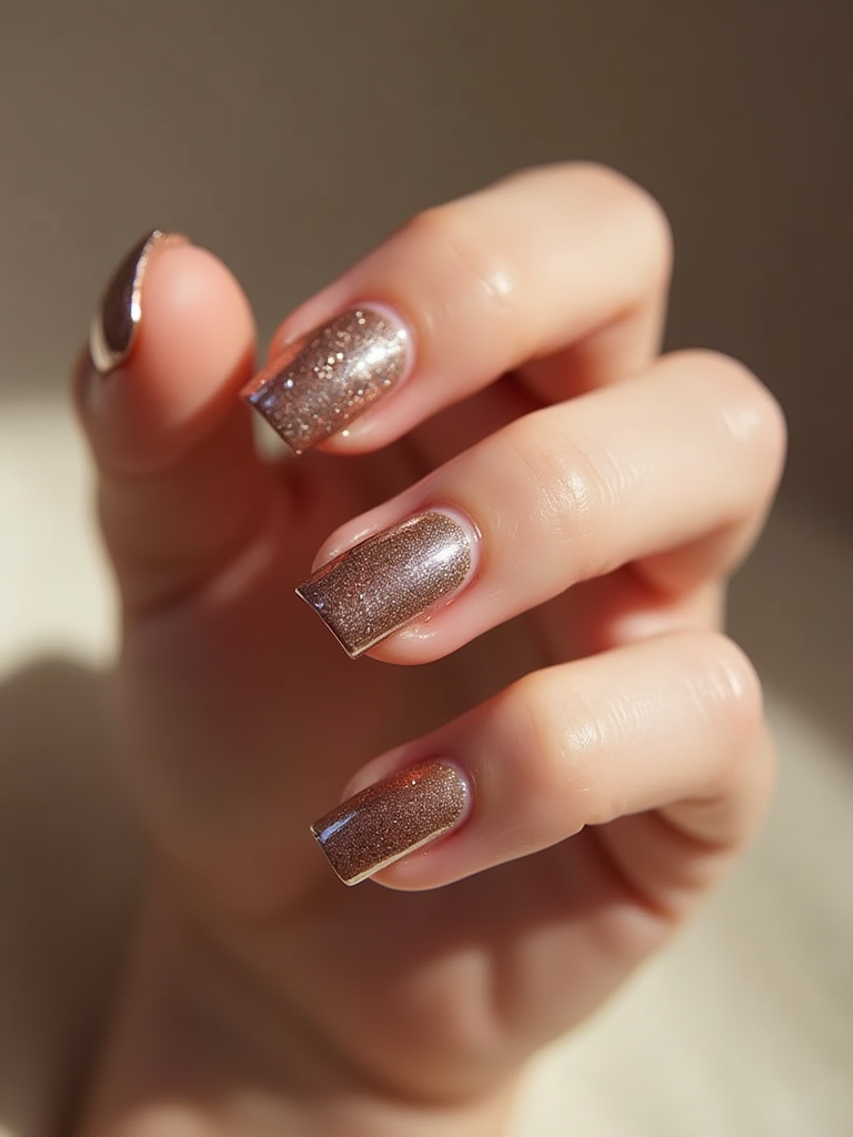 studio shot of chrome glazed donut nails with glossy reflections, hand posed elegantly, modern beauty lighting, high-shine texture visible, magazine-style presentation
