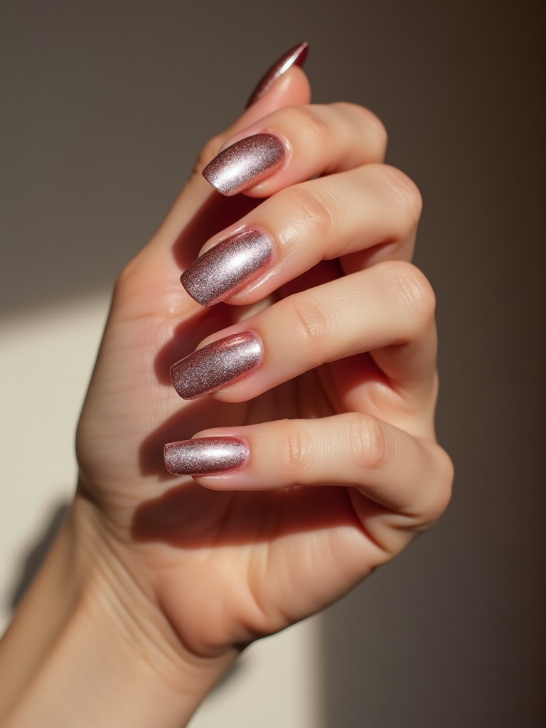 studio shot of chrome glazed donut nails with glossy reflections, hand posed elegantly, modern beauty lighting, high-shine texture visible, magazine-style presentation