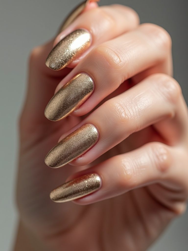 studio shot of chrome glazed donut nails with glossy reflections, hand posed elegantly, modern beauty lighting, high-shine texture visible, magazine-style presentation