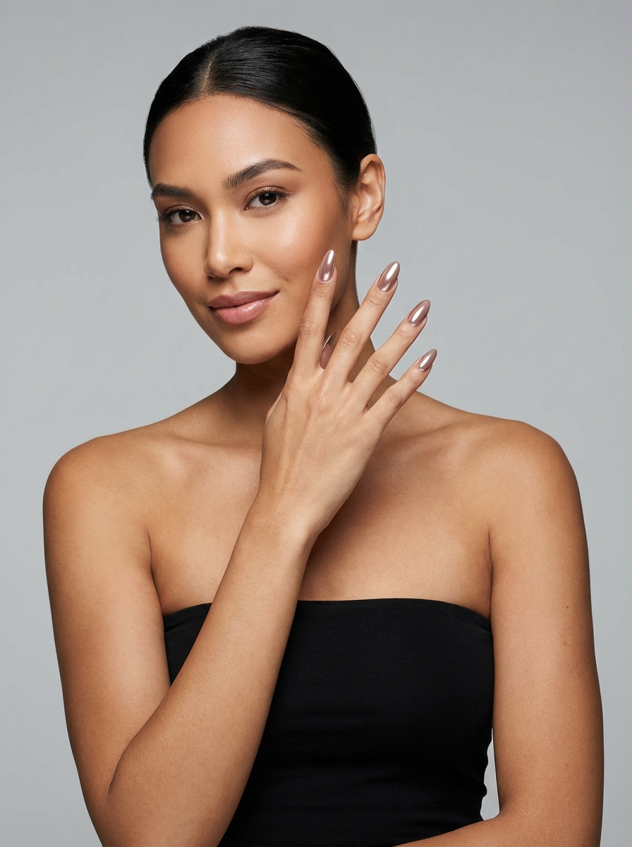 studio shot of chrome glazed donut nails with glossy reflections, hand posed elegantly, modern beauty lighting, high-shine texture visible, magazine-style presentation