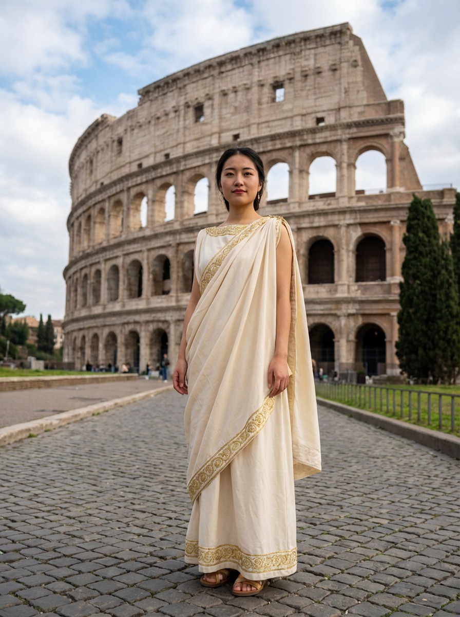 stunning and historical model in Rome wearing a traditional Roman stola/toga, Colosseum in the background