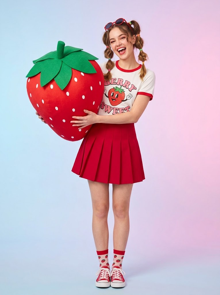 {"style":"high-energy retro portrait","theme":"single fruit motif","fruit_selection":{"rule":"choose only one fruit","purpose":"centerpiece of the entire concept"},"outfit":{"top":{"type":"ringer tee or graphic t-shirt","color":"coordinated with selected fruit","style":"retro playful"},"bottom":{"type":"pleated skirt","color":"bright solid color","fit":"high-waisted youthful silhouette"}},"prop":{"type":"oversized fruit prop","scale":"giant","interaction":"held, hugged, or posed playfully with subject"},"backdrop":{"style":"soft pastel gradient","colors":["pastel blue","pastel pink"],"transition":"smooth two-tone blend"},"mood":["energetic","playful","vibrant","retro pop"],"lighting":{"type":"studio lighting","quality":"bright and even","vibe":"clean colorful editorial look"},"composition":{"framing":"portrait orientation","focus":"subject and fruit prop centered","aesthetic":"bold graphic balance"},"quality":{"resolution":"high resolution","details":"sharp textures vibrant colors","finish":"polished editorial"}}