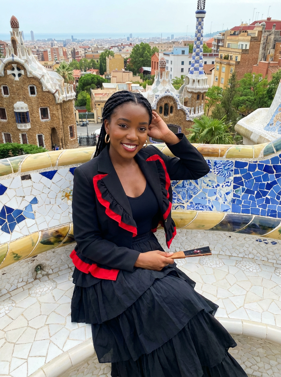 stylish and chic model in Barcelona wearing a flamenco-inspired dress/suit, Park Güell in the background
