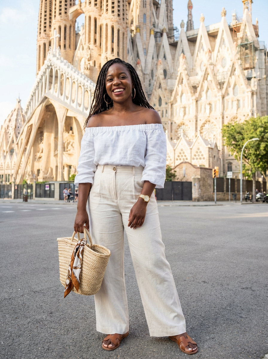 stylish and chic model in Barcelona wearing a stylish summer outfit, La Sagrada Família in the background