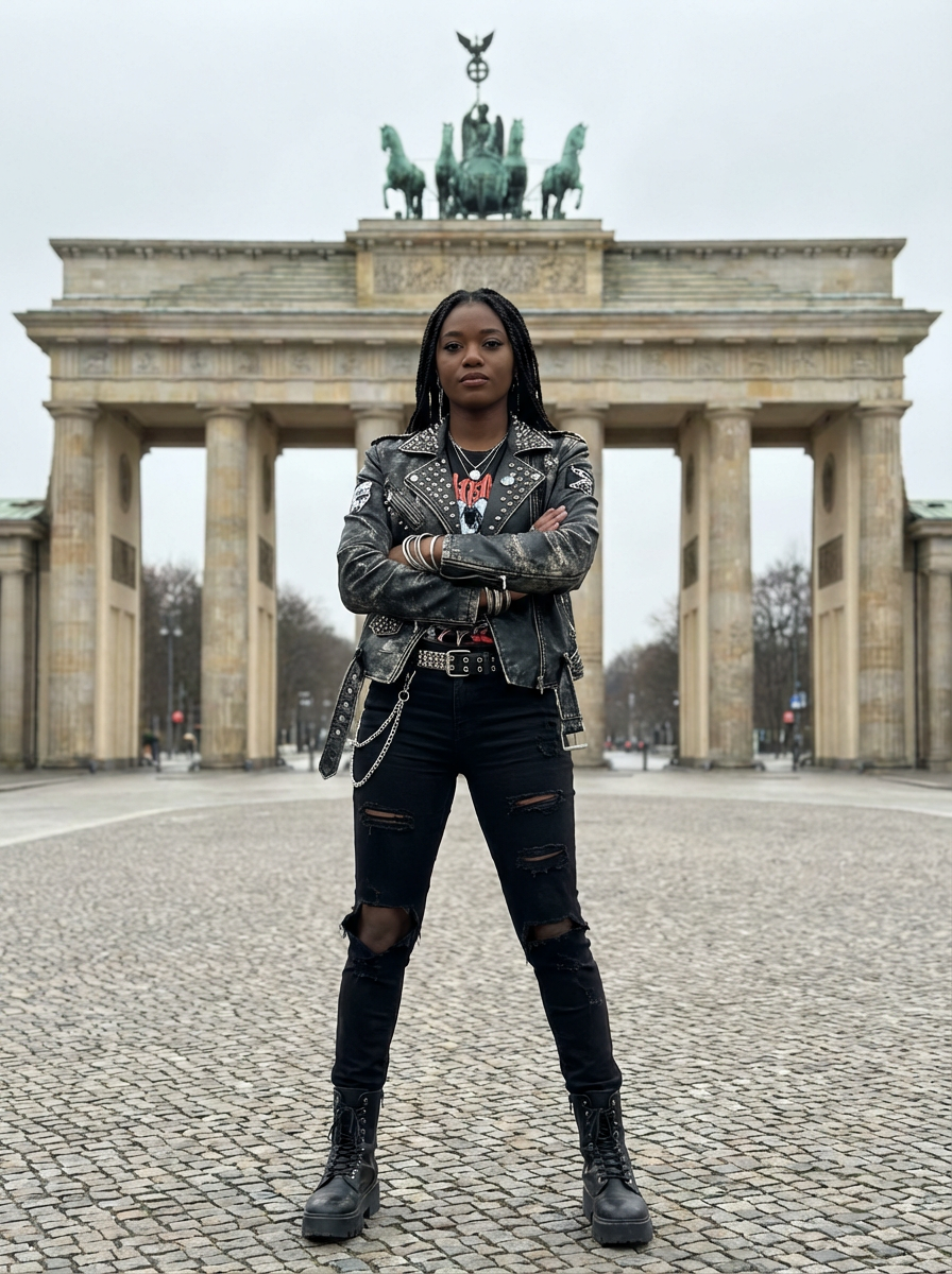stylish and chic model in Berlin wearing a punk-inspired outfit, Brandenburg Gate in the background