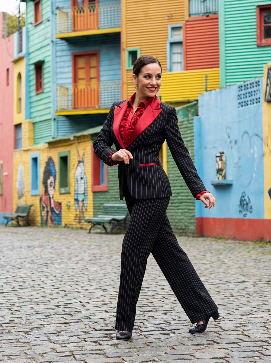 stylish and chic model in Buenos Aires wearing a tango-inspired dress/suit, colorful houses of La Boca neighborhood in the background