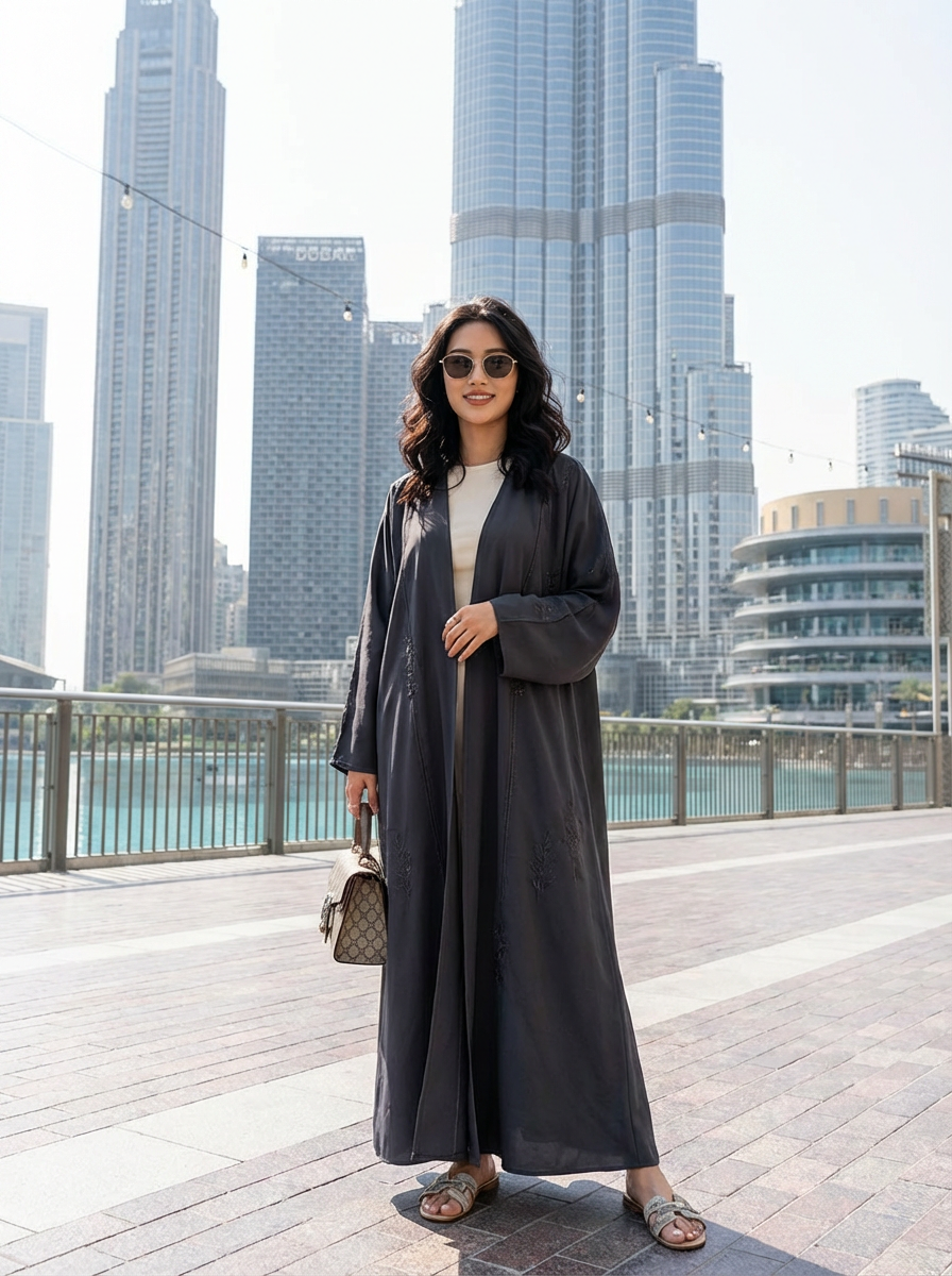 stylish and chic model in Dubai wearing a modern, chic abaya/thobe, skyscrapers of Dubai in the background