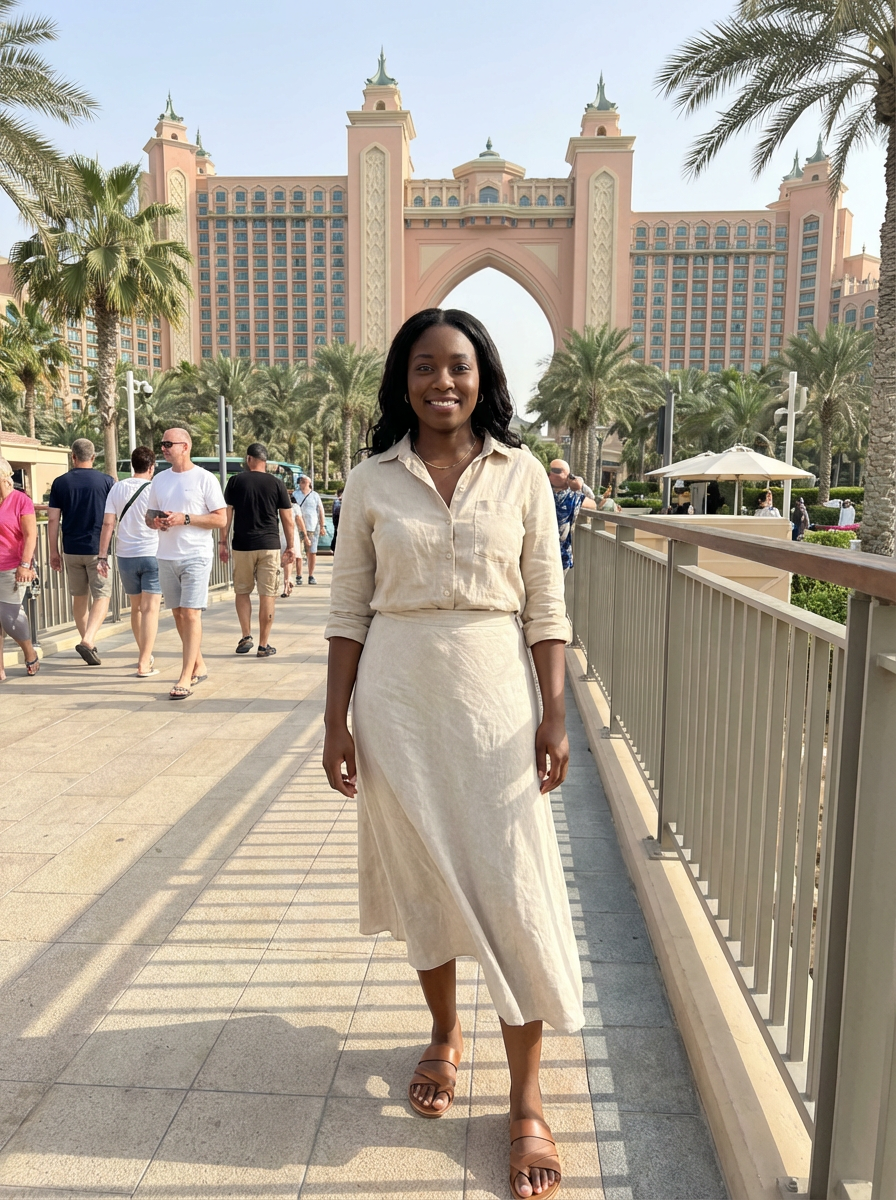stylish and chic model in Dubai wearing a stylish sundress/linen shirt, the Atlantis hotel in the background