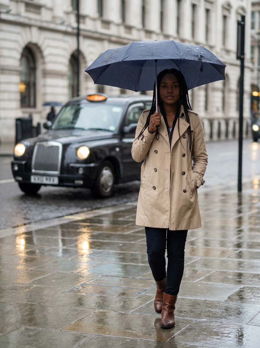 stylish and chic model in London sporting a trench coat and holding an umbrella, iconic London cab in the background