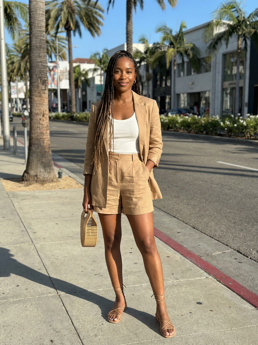 stylish and chic model in Los Angeles wearing a summer dress/linen suit, palm trees in the background