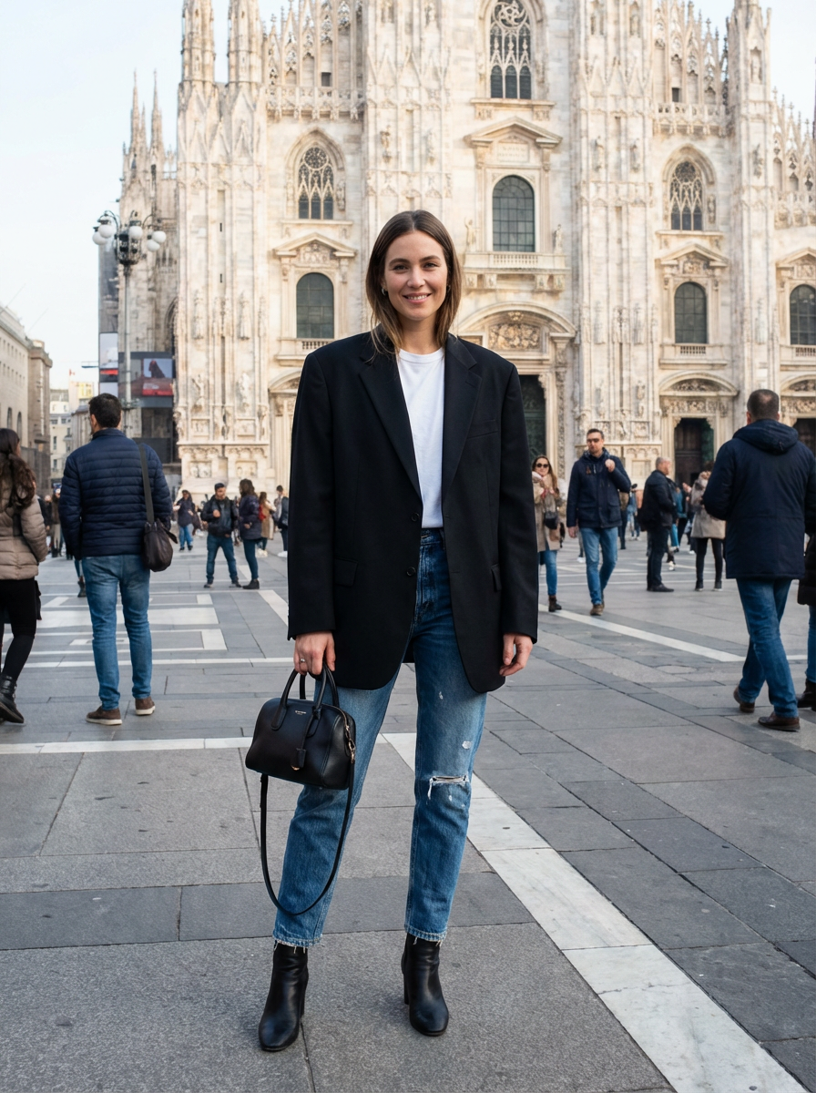stylish and chic model in Milan wearing a fashionable blazer and jeans, Duomo di Milano in the background