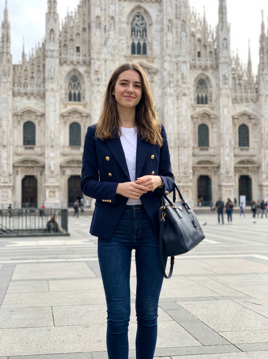 stylish and chic model in Milan wearing a fashionable blazer and jeans, Duomo di Milano in the background