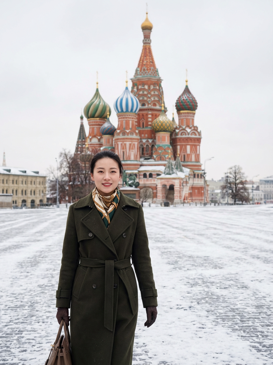 stylish and chic model in Moscow wearing a stylish coat and scarf, Saint Basil's Cathedral in the background