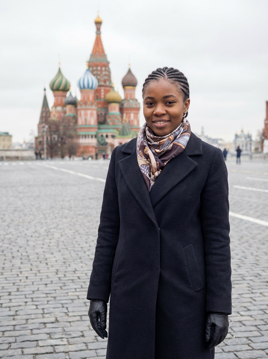 stylish and chic model in Moscow wearing a stylish coat and scarf, Saint Basil's Cathedral in the background