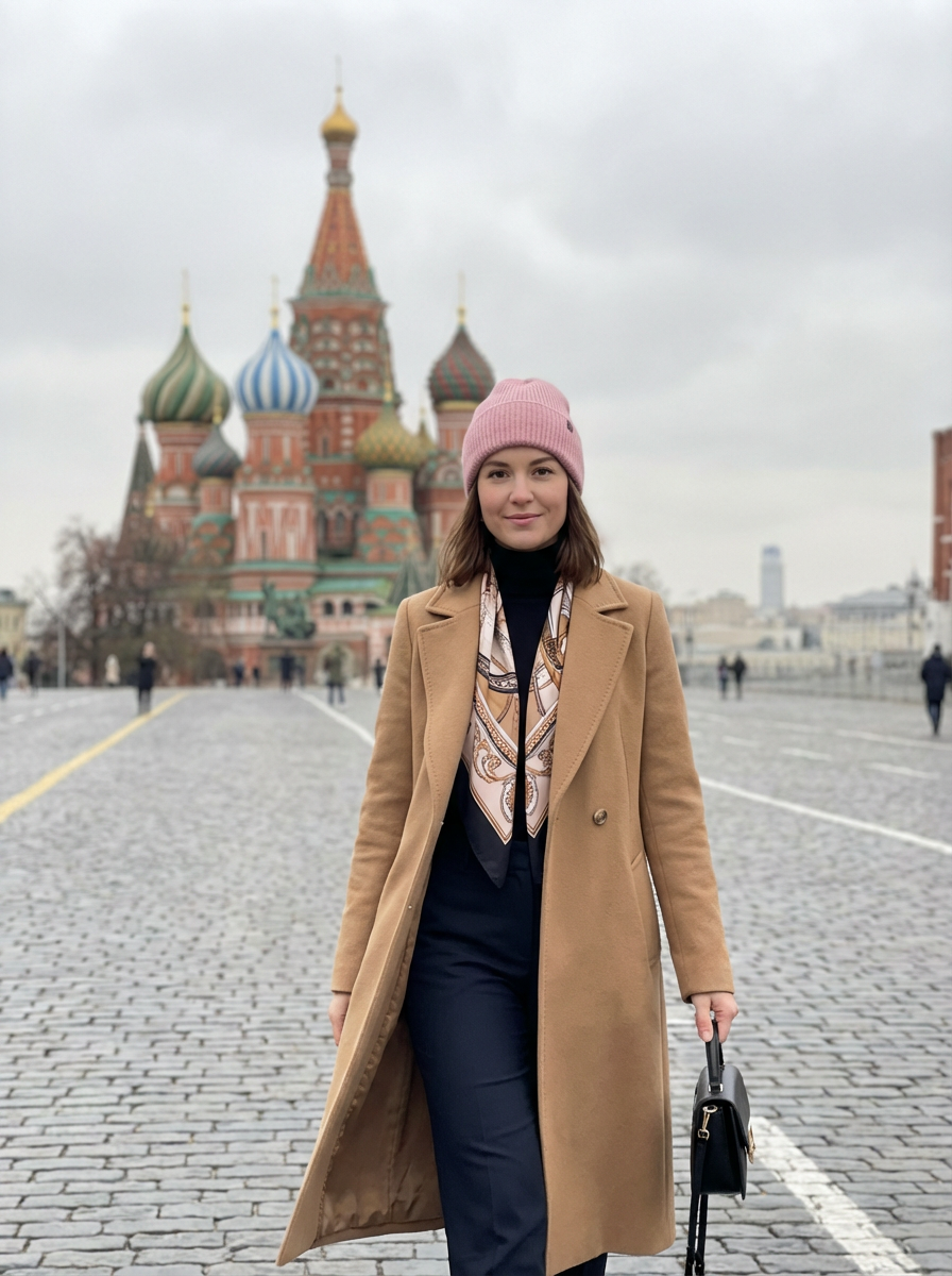 stylish and chic model in Moscow wearing a stylish coat and scarf, Saint Basil's Cathedral in the background