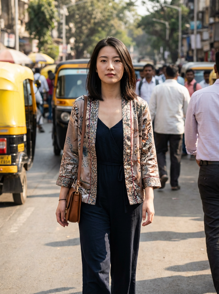 stylish and chic model in Mumbai wearing a contemporary fusion outfit, bustling streets of Mumbai in the background