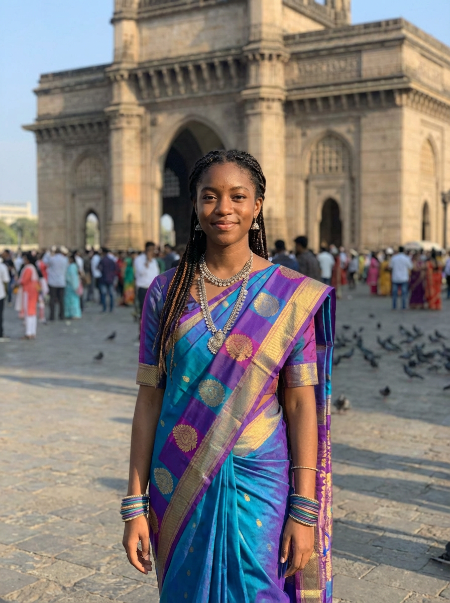 stylish and chic model in Mumbai wearing a vibrant saree/kurta, Gateway of India in the background