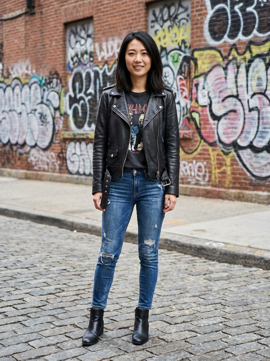 stylish and chic model in New York City wearing a leather jacket, jeans, and boots with urban graffiti in the background