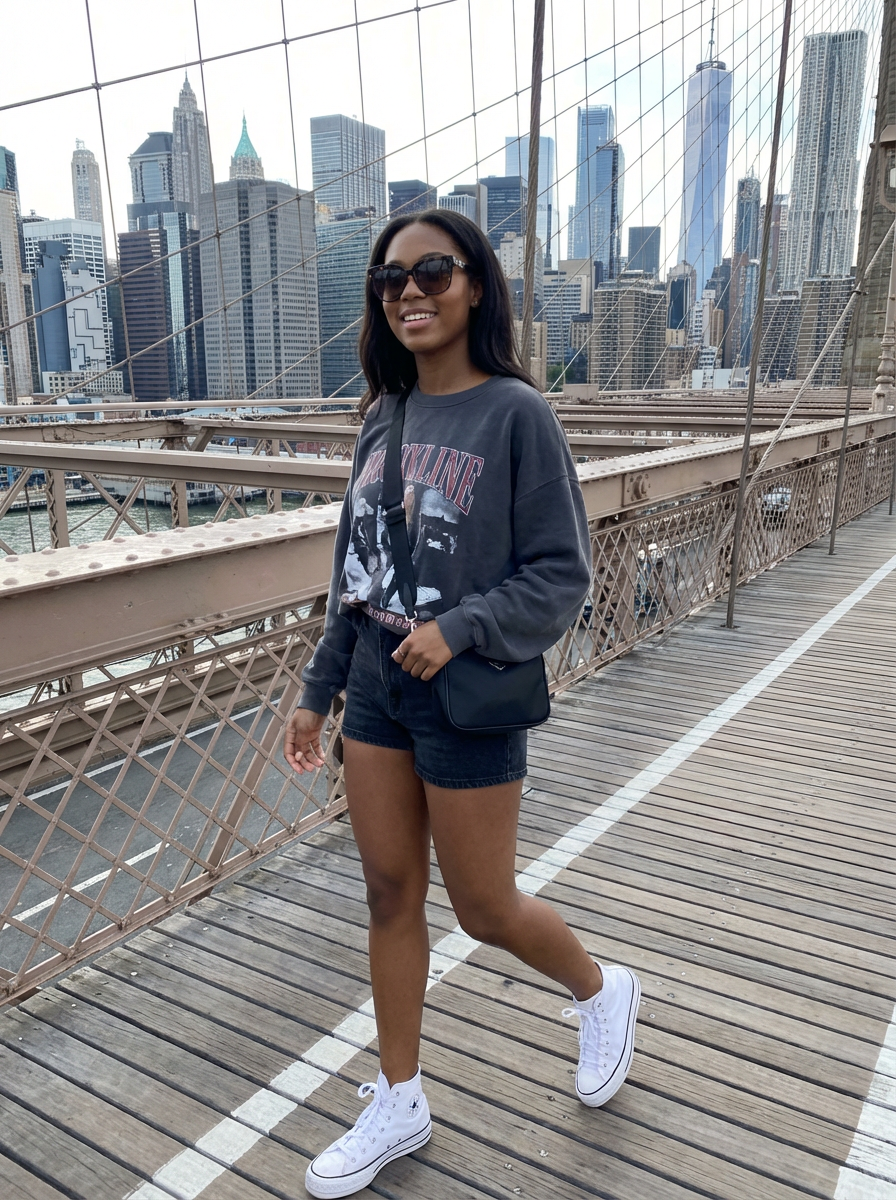 stylish and chic model in New York City wearing an oversized sweatshirt and high top sneakers, Brooklyn Bridge in the background