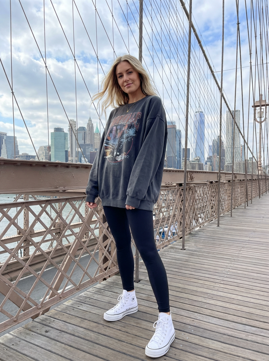 stylish and chic model in New York City wearing an oversized sweatshirt and high top sneakers, Brooklyn Bridge in the background
