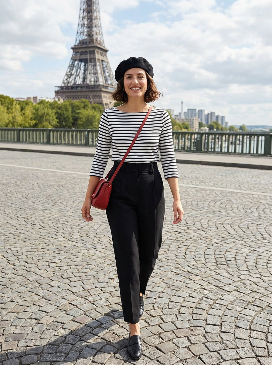 stylish and chic model in Paris, wearing a beret and striped top, Eiffel Tower in the background