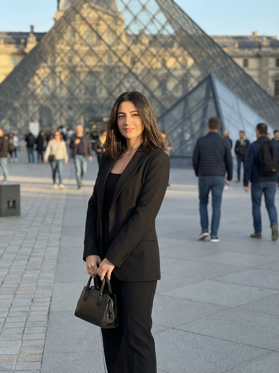 stylish and chic model in Paris wearing a chic black dress/suit, Louvre pyramid in the background