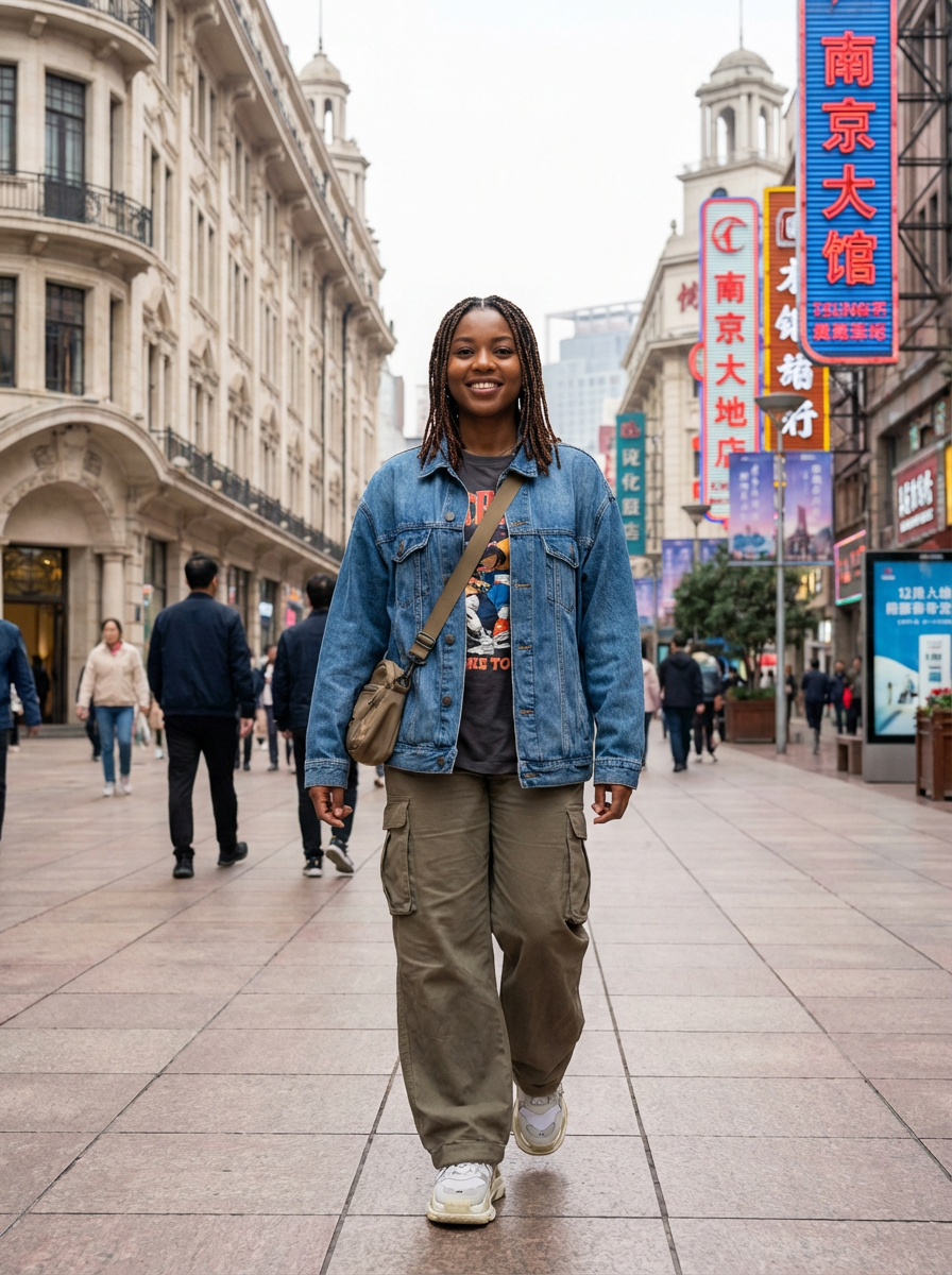 stylish and chic model in Shanghai wearing a contemporary streetwear outfit, Nanjing Road in the background