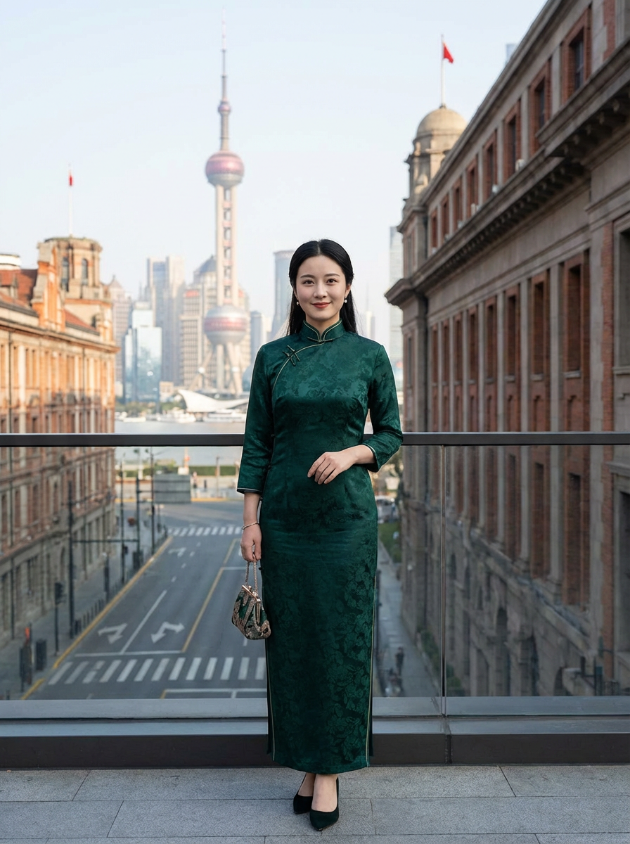 stylish and chic model in Shanghai wearing a traditional qipao/mandarin-collar suit, modern skyline in the background