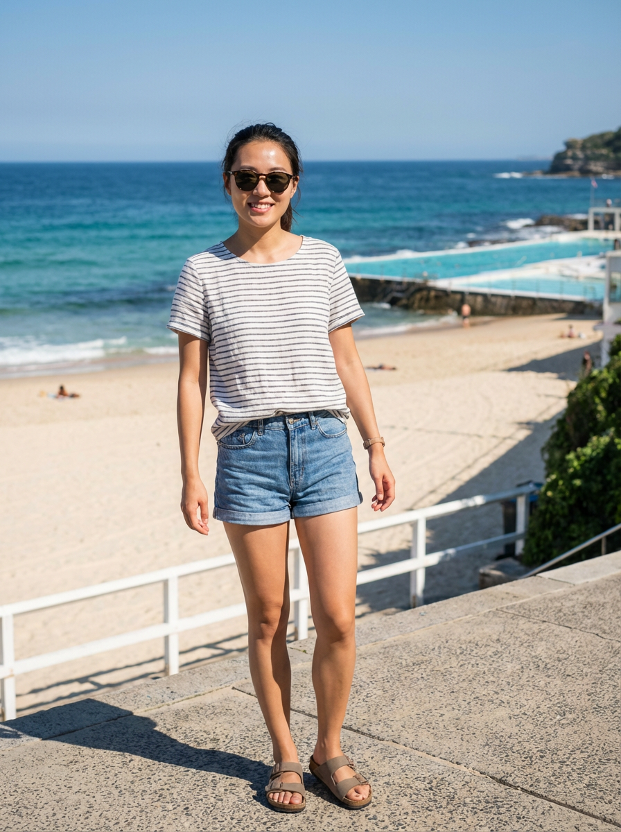 stylish and chic model in Sydney wearing a summer dress/shorts and t-shirt, Bondi Beach in the background