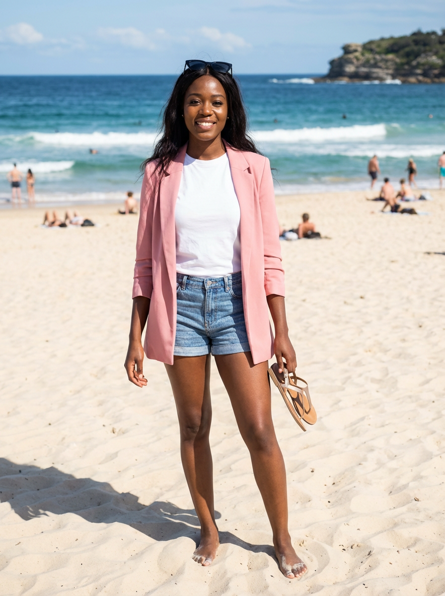 stylish and chic model in Sydney wearing a summer dress/shorts and t-shirt, Bondi Beach in the background