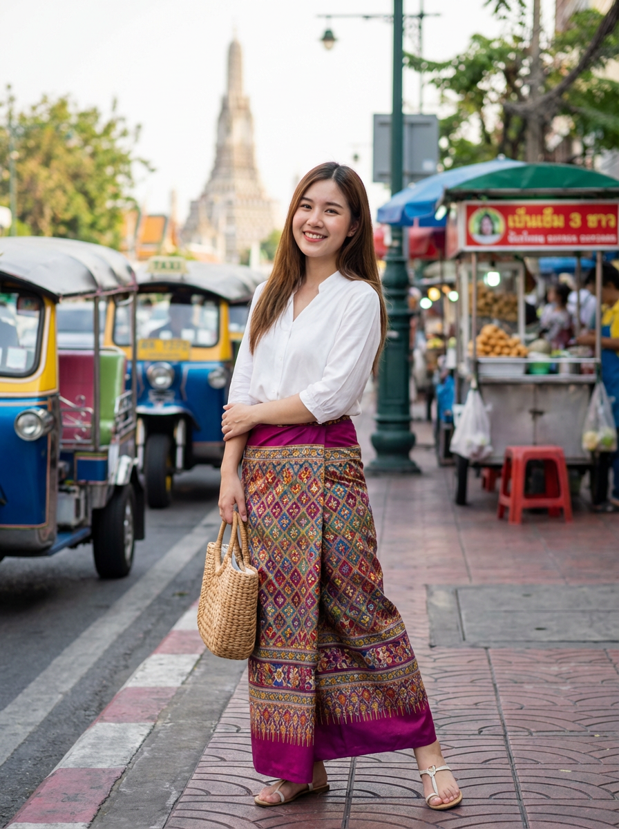 stylish and chic model in Thailand wearing a vibrant sarong, Bangkok in the background