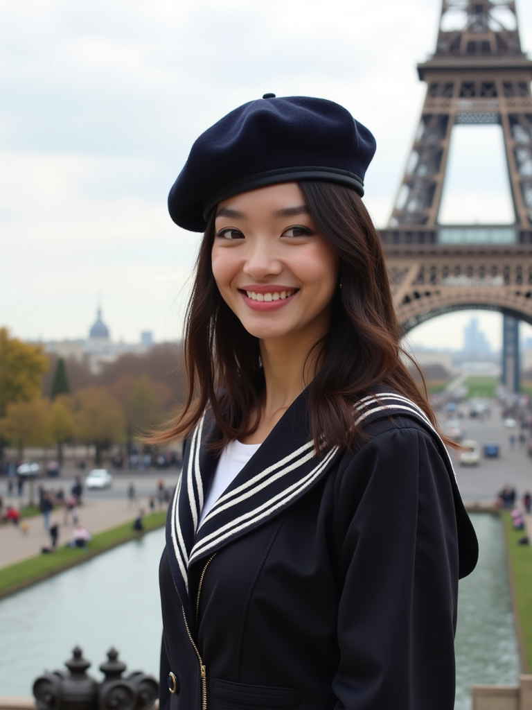 stylish and sophisticated model in Paris wearing a traditional Breton shirt and beret, Eiffel Tower in the background