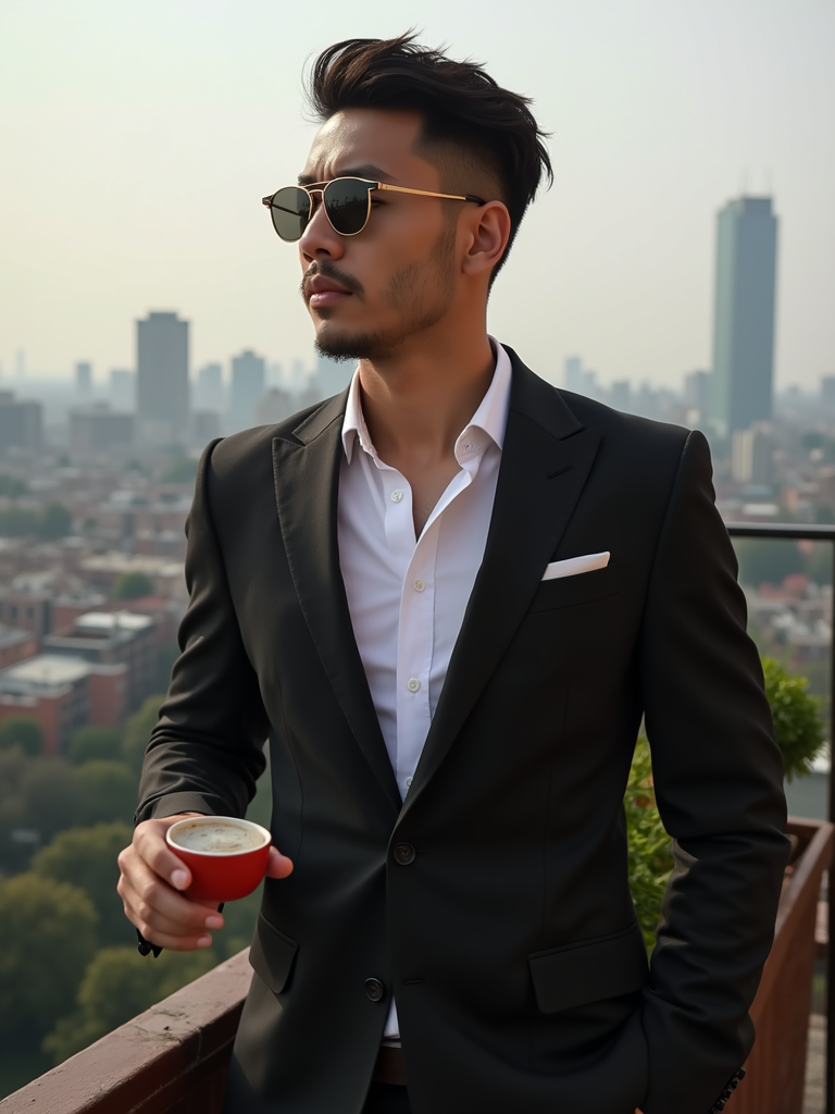 stylish masculine model dressed up for a classy rooftop bar setting