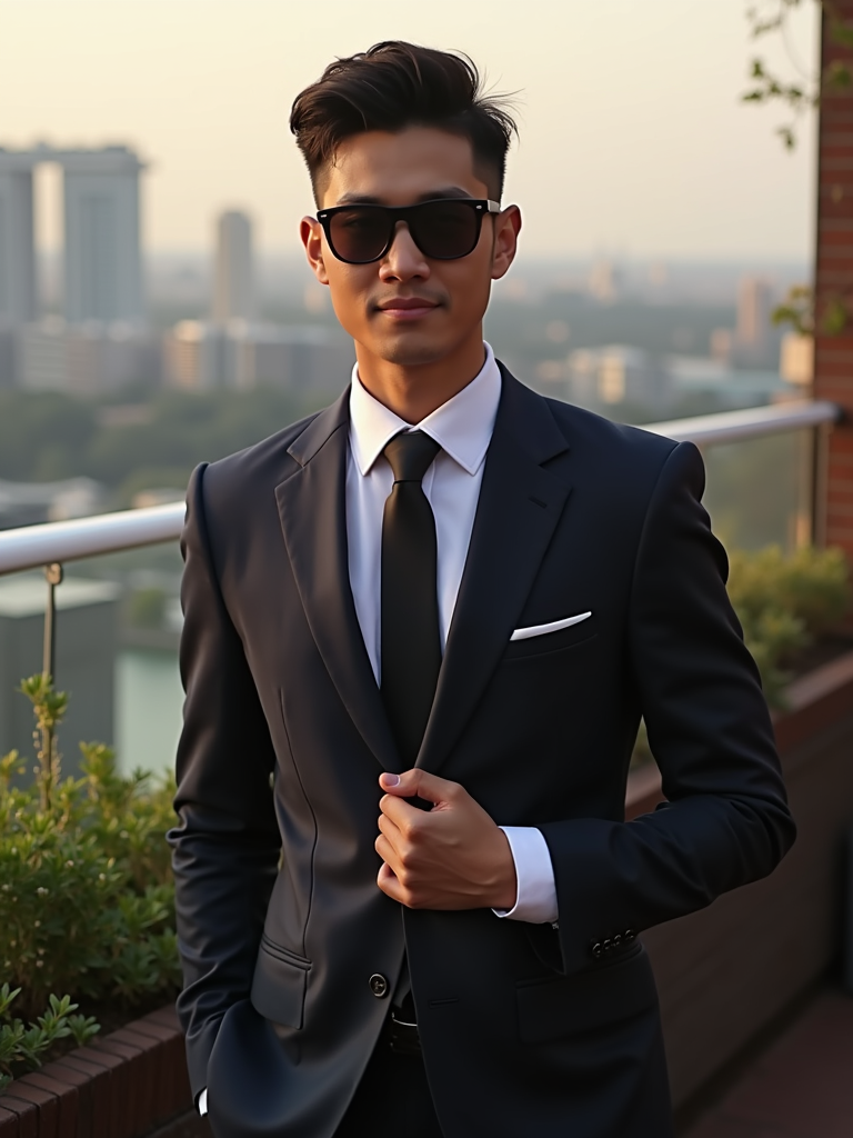 stylish masculine model dressed up for a classy rooftop bar setting