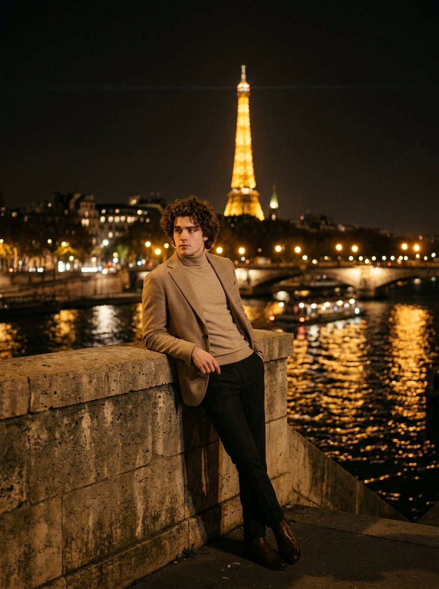 {"subject_and_scene":{"main_subject":"A young model with thick curly brown hair, wearing a sophisticated beige turtleneck sweater and a matching tailored wool blazer, displaying a contemplative and moody expression.","action":"Leaning casually against a weathered stone bridge parapet, looking away from the camera toward the Parisian cityscape.","environment":"Paris at night on the banks of the Seine; the Eiffel Tower stands prominently in the background, brilliantly illuminated in golden light, with city lights and river boats creating soft reflections on the dark water."},"cinematography":{"camera_woman":"Sony Venice 2","sensor_type":"Full Frame","shot_type":"Cowboy Shot","camera_angle":"Eye Level","movement":"Static"},"optics":{"lens_type":"Spherical","focal_length":"35mm (Standard Wide)","aperture":"f\/2.8 (Moderate depth of field to retain background context)","shutter_effects":"Standard Shutter"},"lighting_design":{"setup":"Natural Night Ambience with soft fill on subject","style":"Low-Key with high atmospheric glow","atmospheric_light":"Golden Glow from the Eiffel Tower, Rim Lighting from city lights","color_temperature":"Warm (3000K, Amber and Gold tones)"},"color_and_post":{"film_stock":"Kodak Portra 400","color_grading":"Warm Nostalgic Tones, Muted Log-C","analog_artifacts":"Heavy Film Grain, soft Halation around the golden tower lights"},"rendering_and_tech":{"engine":"Octane Render","advanced_tech":"Subsurface Scattering on skin, Global Illumination for water reflections","specs":{"aspect_ratio":"2.39:1 (CinemaScope)","resolution":"8K, Photorealistic, Hyper-detailed"}},"directorial_style":"Denis Villeneuve (Atmospheric mood and pensive composition)"}